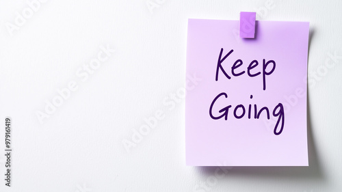Sticky Note: A single purple sticky note with the words "Keep Going" written in simple, clear handwriting. The sticky note is on a plain white background, highlighting perseverance and encouragement.