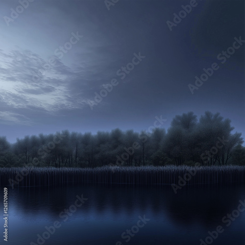 lake, forest, dark blue, night, sky, water, calm, moody, peaceful, serene, landscape, minimal, dreamy, misty, twilight