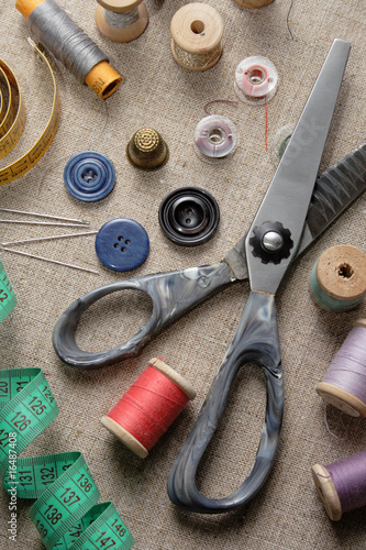 sewing, supply, tailor, kit, set, tool, instrument, accessory, sew, sartorial, notion, needle, measuring tape, scissors, spool, tape, thimble, thread, bobbin, buttons, canvas, measure, mending, fabric, clothing, item, texture, plastic, closeup, closeup, vertical
