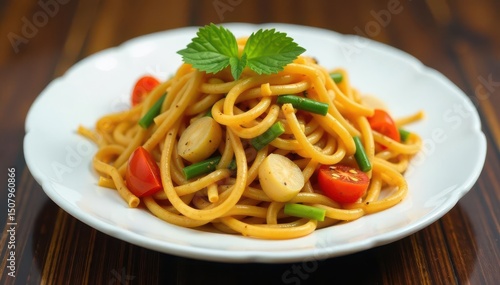 Stir-fried noodles with vegetables on white plate, ginger, culinary