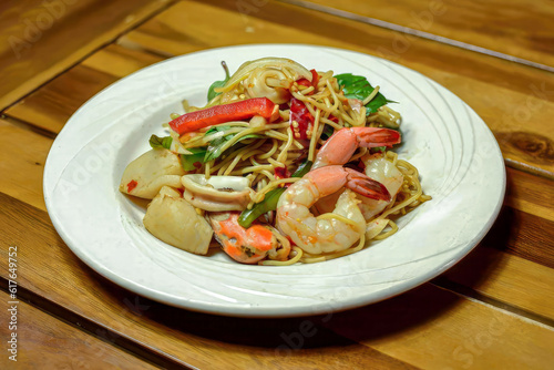 Stir-fried Spaghetti with Seafood, Stir-Fried Pasta with Kra Baow, Stir-Fried Seafood Noodles, Mixed Culture Cuisine