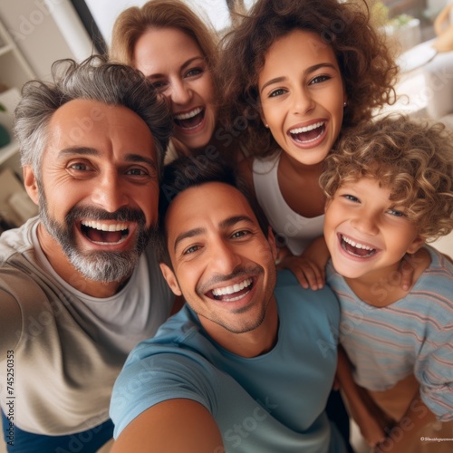 Stock image of a family taking a group selfie or a photo together, smiles and memories Generative AI