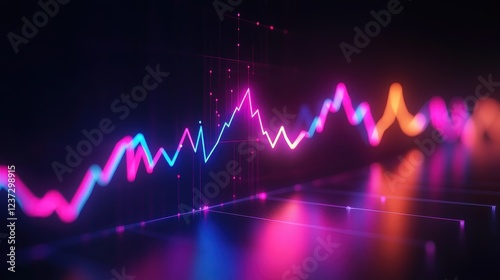 Stock market growth, neon-colored upward graph, 3D illustration.