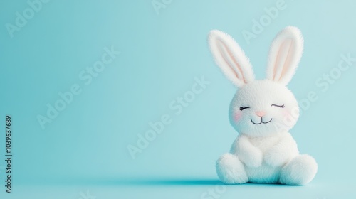 Stock minimalist photography of a happy bunny with closed eyes sitting on a pastel blue background with delicate shadows, creating a gentle and cheerful look