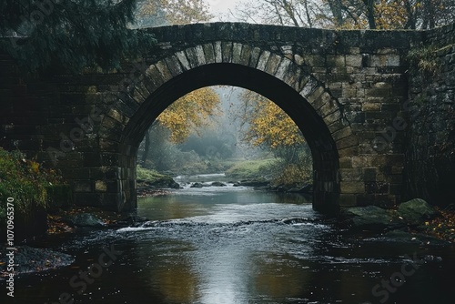 bridge, stone, arch, creek, river, water, flowing, autumn, forest, tree, leaf, fall, nature, landscape, timberland, mossy, green, brown, yellow, dark, light, shadow, perspective, scenic, tranquil, serene, peaceful, misty, fog, travel, journey, beautiful, picturesque