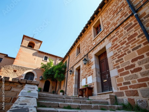 architecture, building, stone, step, courtyard, historic, spanish, old, travel, europa, mediterranean, summer, sunny, daytime, exterior, facades, wall, brick, doorway, door, window, plant, tree, stair, pathway, heritage, ancient, rustic, design, house, home, real estate, property, landscape, scenery