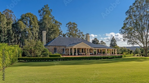 house, stone, column, lawn, expansive, grass, green, tree, sky, blue, cloud, sunny, day, landscape, architecture, home, building, rural, tranquil, serene, peaceful, nature, outdoors, garden, hedge, shrub, plant, foliage, estate, property, luxury, elegant, roomy, veranda, patio, backyard, view, beautiful, majestic, residential