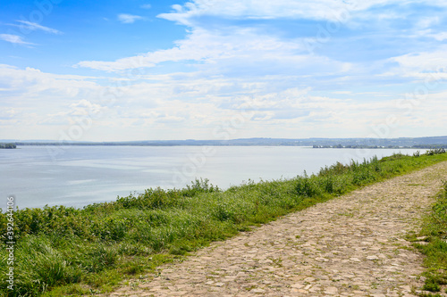 stone path on the high Bank of the river on a Sunny summer day