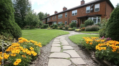 Stone pathway surrounded by yellow flowers and green shrubs leading to brick houses in a suburban neighborhood, perfect for real estate, gardening, home exterior, outdoor lifestyle images with natura