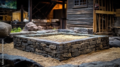 stone, wall, enclosure, ground, sand, rock, brick, structure, construction, landscape, design, architecture, building, garden, yard, setting, scene, detail, texture, material, rustic, rough, dark, grey, brown, tan, beige, earth, dirtied, natural, element, background, image, photo, photo, view, perspective, feature, space, area, location
