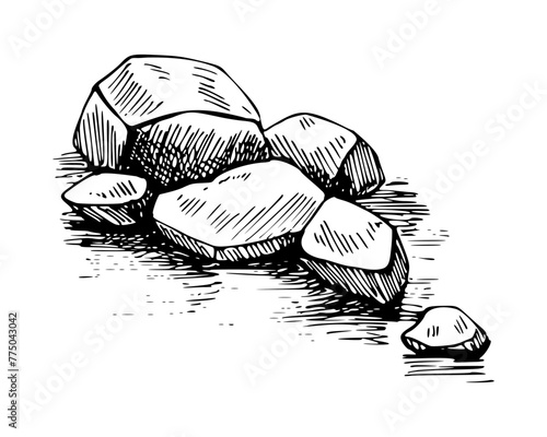 Stones vector sketch. Hand drawn illustration with painted by black inks on isolated background. Engraving nature. Monochrome drawing natural stack of rocks in line art and doodle style