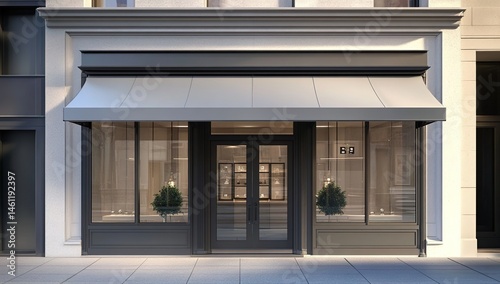 Store exterior with light walls, dark gray frames, awnings, lit display windows, and double doors.