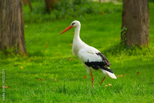Stork Bird walks through the green thickets of plants. Concept of newborn pregnancy and childbirth with space for text. White stork close up.