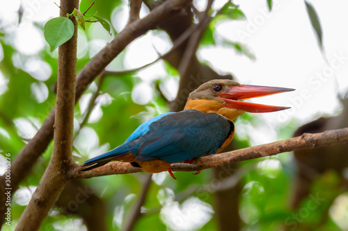 Stork-billed Kingfisher perching on tree branch with green bokeh background , Thailand