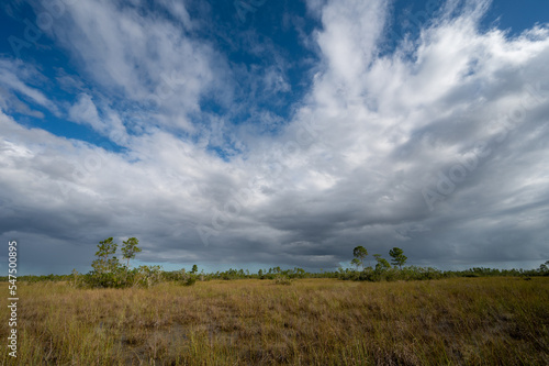 Storm clouds over sawgrass prairie in Everglades National Park, Florida on sunny autumn morning.