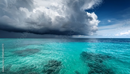 stormy clouds gather over tranquil turquoise sea