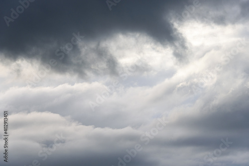 Stormy gray skies with some clouds highlighted white by the sun, as a nature background
