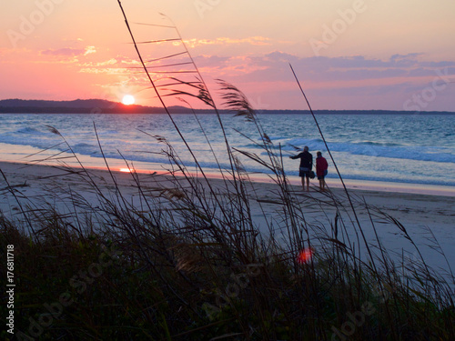 beach, ocean, setting sun, red sky, sunset, sky, fish, blue, summer, fisherman, nature, silhouette, leisure, vacation
