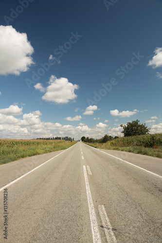 straight road thru fields in sunny day with cloudy blue sky, vertical