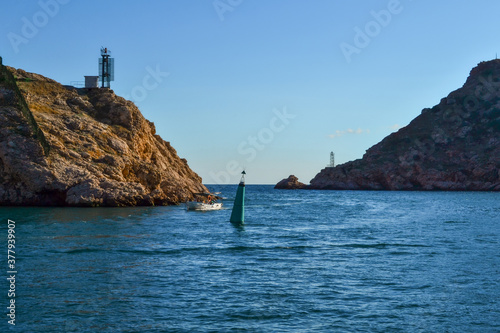 strait between two rocks, mountains with ships, boats and buoys against blue sky, balaclava town, Crimea in Black sea, sunset
