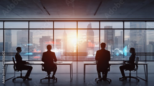 analysis, city landscape, skyscraper, sunset, sunrise, meeting, teamwork, strategy, planning, technology, digital, screen, chart, graph, business meeting, corporate, finance, investment, trading, market, professional, silhouette, backlight, copy space, contemporary, sleek, elegant, sophisticated, successful, ambition, growth, future, progress, global, panoramic view, highrise, urban, city, stock exchange