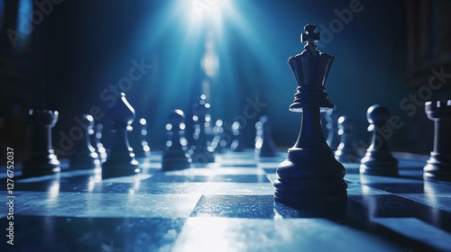 Strategic Game: Chessboard Focus. Illuminated pieces poised for battle. A king stands tall amidst strategic depth, showcasing intelligence and control.