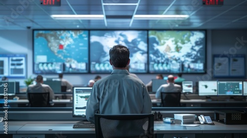 Strategic Planning Disaster Relief Coordinator Analyzing Weather Models and Rescue Operations in Situation Room