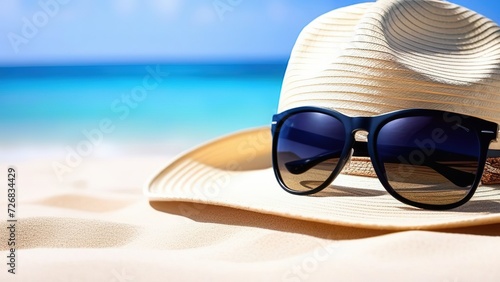 Straw hat, sunglasses on a sandy beach by the sea or ocean, a place for text, the concept of rest and travel