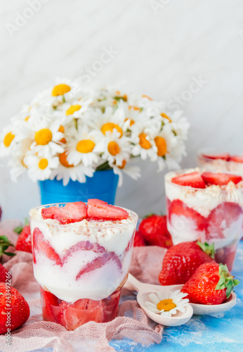Strawberries with cream or tiramisu in small glasses