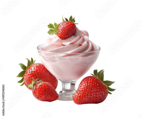Strawberry dessert with creamy swirl served in a glass bowl on a transparent background, cut out