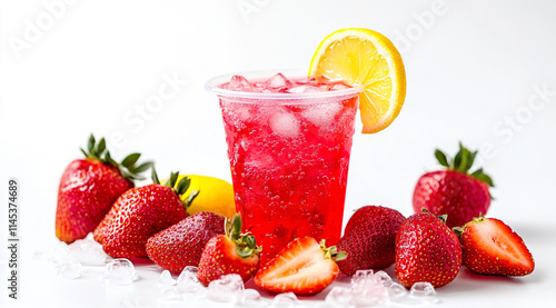 Strawberry Lemonade with Ice Cubes in a Plastic Cup