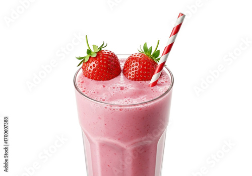 Strawberry milkshake with fresh strawberries and straw isolated on transparent background