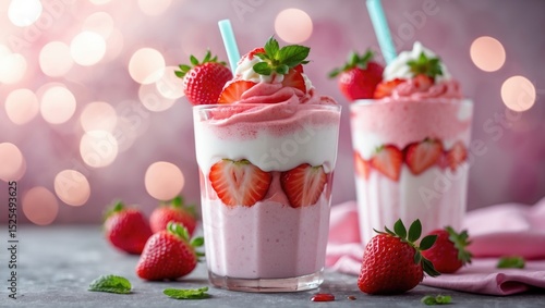 Strawberry milkshake with strawberries and whipped cream, with a blurred bokeh background. Refreshing dessert and beverage. Summer treat and strawberry flavor.