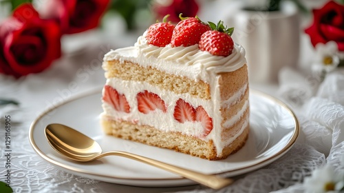 strawberry, shortcake, cream, frosting, white, plate, red, rose, blurred, background, bright, natural, lighting, soft, sharpened, patisserie, pastel, tone, sweet, delicate, fluffy, elegant, dessert, creamy, lush, romantic, floral, tender, inviting, charming, delicious, refined, airy, subtile, whimsical, fresh, lovely, indulgent, appetising, pretty, serene, tasteful, dreamy, graceful, luxurious, soothing, festive, beautiful