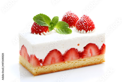 Strawberry shortcake with whipped cream and decorated strawberry isolated on white background