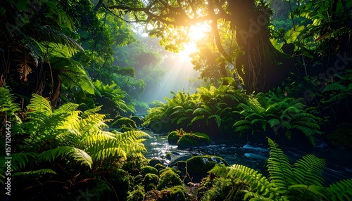 stream, flowing, forest, green, sunlight, tree, fern, leaf, moss, rock, plant, water, nature, landscape, river, tropical, jungle, lush, environment, outdoors, growth, creek, wood, scenery, foliage, bright, ray, scene, natural, wild, conservation, ecology, travel, relaxation, tranquil