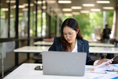 Stressed businesswoman sitting at desk with laptop, tablet computer under work stress worrying about digital investment marketing plan
