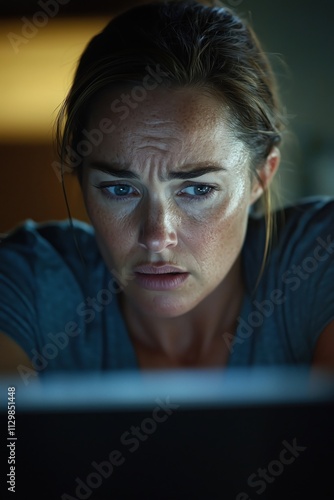 woman, stressed, laptop, blue eye, brunette, closeup, work, night time, worried, technology, tension, emotional, serious, detail, home office, casual clothes, modern, reflective, computer, isolation, challenge, fatigue, productivity, expressive