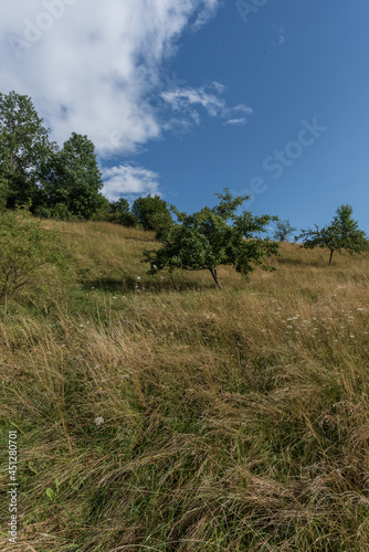 Streuobstwiese im Sommer bei Sonne udn blauem Himmel mit Wolken