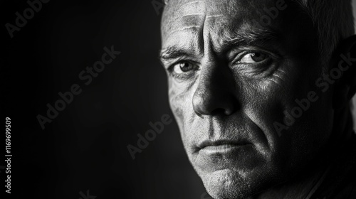 Strict portrait of a man in black and white tones, strong shadows and contrast, studio lighting