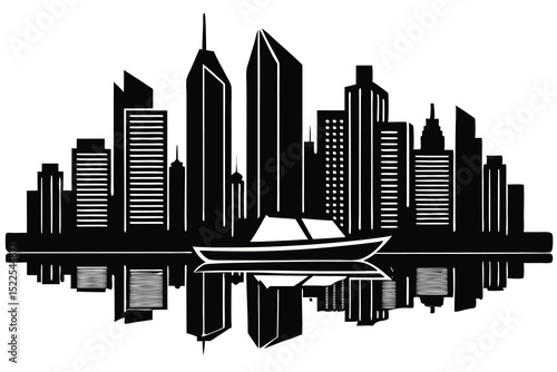 Striking Black and White Cityscape Silhouette with Boat and Water Reflection Design Illustration
