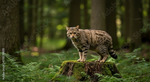 wildcat, cat, forest, animal, wildlife, mammal, nature, predator, wild, european, environment, felino, carnivore, wood, tree, trunk, stump, moss, fern, green, brown, shadow, timberland, wilderness, habitat, hunting, stalk, fur, striped, camouflage, alert, attentive, watchful, gaze, looking, portrait, species, creature, fauna