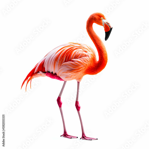 Striking flamingo portrait standing gracefully on one leg against white background