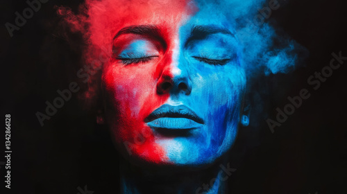 face paint, red, blue, smoke, portrait, artistic, expression, creativity, dramatic, colours, beauty, emotion, art, model, photo, surreal, vibrant, contrast, make-up, human, closeup, head shot, abstract, fantasy, colourful, aethereal, glowing, light, shadow, emotional, serene, calm, creative, unique, striking, bold, high-coloured, expressionism, modern art, contemporary, visual, inspiration