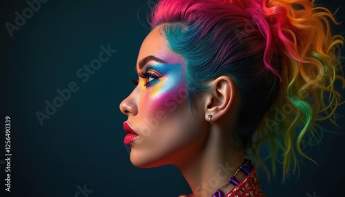 Striking profile portrait of woman with vivid multicolored rainbow curly hair and glamorous artistic makeup. Colors symbolize diversity, creative expression and bold fashion choice in modern style.