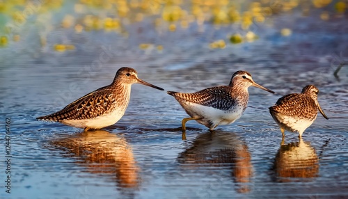 Striking Wood Sandpiper Tringa glareola Amidst a Winter Polish Landscape at Dawn, Capturing the Tranquil Beauty of Europes Wildlife.