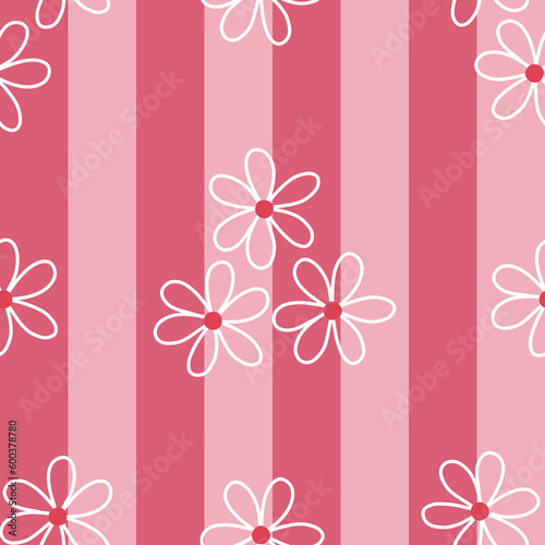 Striped floral seamless pattern. Vertical pink shade lines and nand drawn white flowers. Raster allover print