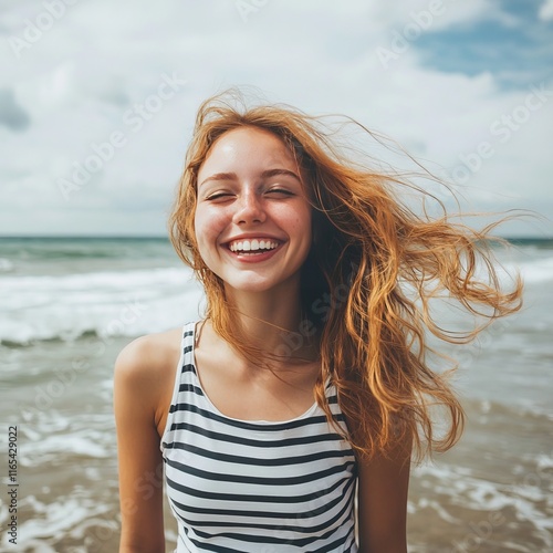 Striped vest-clad woman grins by the sea