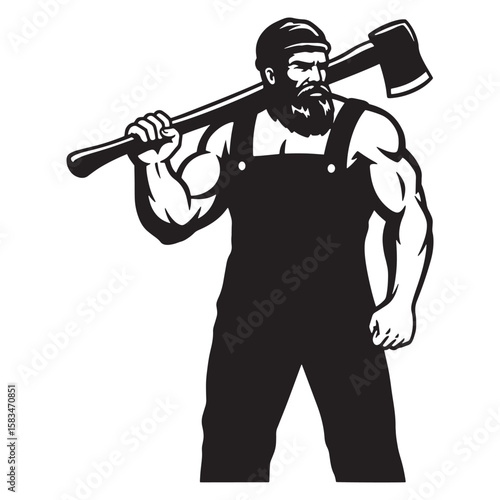 lumberjack, axe, lumberjack, logger, beard, silhouette, black-and-white, strong, powerful, muscular, work, profession, forest, tool, timber, carving, vintage, retro, illustration, vector, isolated, graphic, design, art, symbol, badge, logotype, emblem, hard work