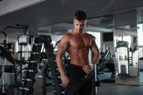 Strong sexual handsome young man model with a bare muscular torso working out in the gym